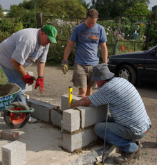 HELP YOUR ALLOTMENTS SHOP As you may have noticed, work on our lovely new shop began a couple of weeks ago with a concrete base. Now bricklaying was supposed to be done by professional builders but they have let us down. This means that we need to do all the work ourselves as we can't afford to waste time. Frank and five quick-learning volunteers had a fun time laying the first layers of blocks on Saturday but there are lots more to be laid, and then there's the roof and doors and...a lot more work to do. If you can help at all, please contact Frank (franksmith888@yahoo.com) or simply come to the building site next weekend. If you have building skills, that's great but don't worry if you don't because under Frank's watchful eye you will be a skilled builder in no time! |