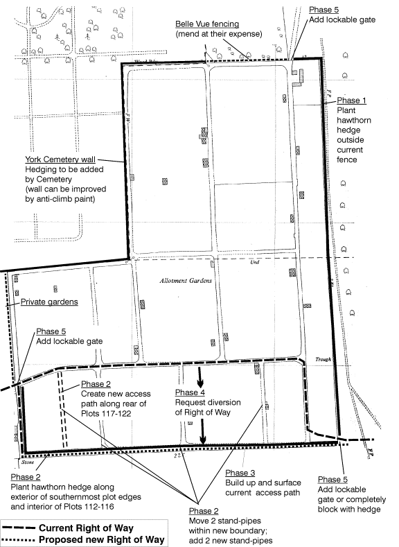 Al suggested that Phase 1 (see map overleaf) – the planting of a hedge along the eastern perimeter – would not be controversial and would prevent people cutting through gaps in the fenceline, which several plotholders on that side had complained about. However, this would not be effective for securing the site as a whole unless we could create a continuous perimeter, with lockable gates; the Police, Mayfair Security and allotment sites elsewhere regard this as essential. To achieve this, we would have to do something about the Public Right Of Way (PRoW) running through the middle of our site. Scarcroft Allotments have fenced either side of a similar path through their site, with numerous gates onto the access paths, but Al suggested that this solution was ugly, less effective and very expensive to purchase and maintain. On 24 June, Al had met Paula Dunn, the Council’s Assistant PRoW Officer, who had confirmed that if we wish to divert the footpath along our path around the southern edge of the site, a Diversion Order could be granted on the grounds that it will bring material benefits to both the tenants and the landowner, providing that the new path is of equal quality to the existing one. She also agreed that the side paths are not PROWS, but access paths for the use of allotment tenants only. She suggested that we put up signs to this effect as a first step. With the PRoW diverted, we could plant a continuous hedge along the whole southern perimeter (Phase 2) and retain only two, or possibly three, lockable gates. The plotholders who would be most adversely affected by this scheme would be those in Plots 112 to 122, who would all stand to lose a narrow strip of ground to the hedge and the new access path which would become necessary. This would be compensated for by a reduction in rent – and by improved security for all the plots south of the path.